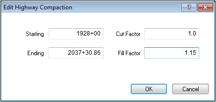 This window allows you to edit the cut and fill compaction factors for adjusting the calculated volumes when creating the mass haul diagram and haul report.