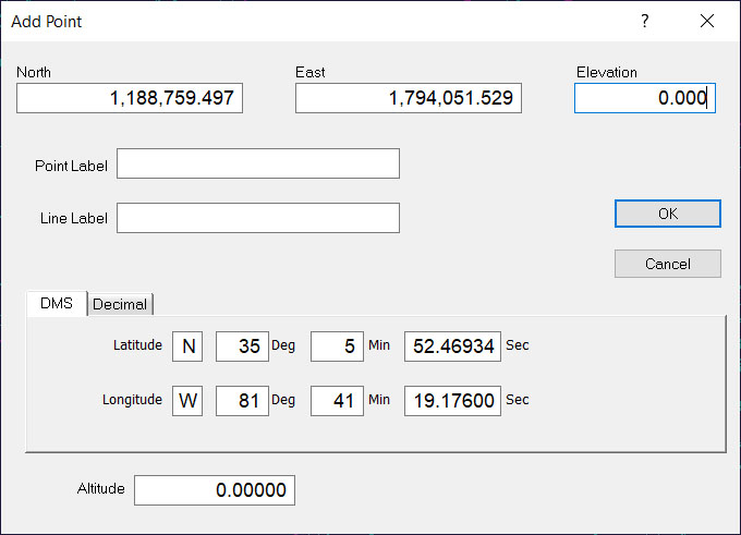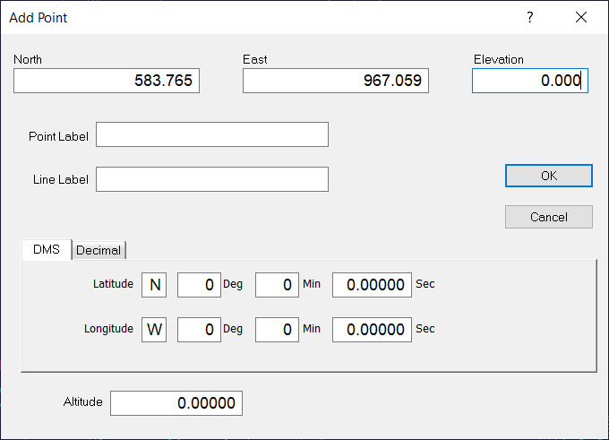 Make any changes the coordinates, elevation or labels and press OK to enter the new point. |