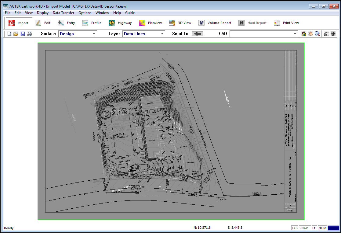 Import Mode is used to transfer the layers of a CAD file into Earthwork 4D. Different layers can be chosen and sent either the Design or Existing Surface. The data can be further defined by transferring the lines to a specific layer within each surface.
