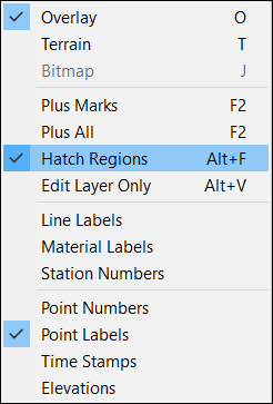 The Hatch Regions command toggles On/Off the display of a hatch pattern to check for overlapping areas/regions, such as Report Regions, Stripping Areas or Sectional Areas. Overlapping areas are indicated by a cross-hatching pattern instead of the single hatch pattern of a non overlapping area. The keyboard shortcut is Alt-F.