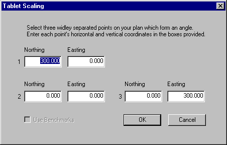 This command is only available when the Tablet Entry option is checked under the Options menu. When Tablet Scale is selected the Tablet Scaling window displays.