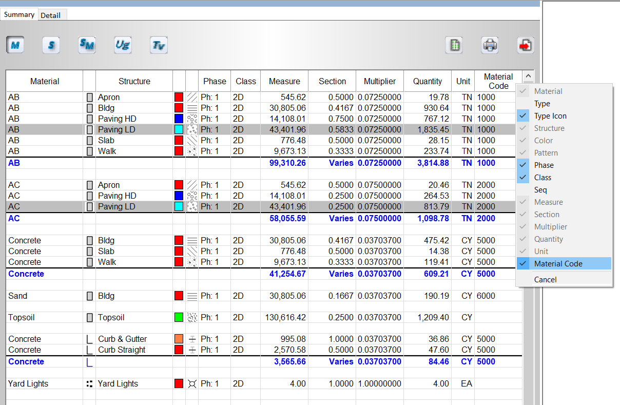 To display the cost code on the Materials or Structures Report, right click on the header row and check Material or Structure Code.