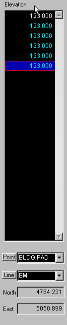 The North and East coordinates for the currently highlighted point are displayed here. The highlighted point flashes on the data line. Use the up and down arrows to scroll through the point list of us the Right Mouse button and select the point on the list. |