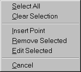 Allows a point to be added to the selected line. By default, the line is added as an Entered point using the elevation of the selected point. The new point is added above the selected point, or toward the head of the line on the list. When Insert Point is selected, the Point Editor window displays. |