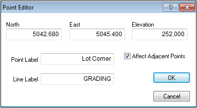 Change the North, East and Elevation as needed and assign any labels. Checking the Affect Adjacent Point pox causes any other lines which share that point to be modified as well. Press OK to apply these changes and close the window.