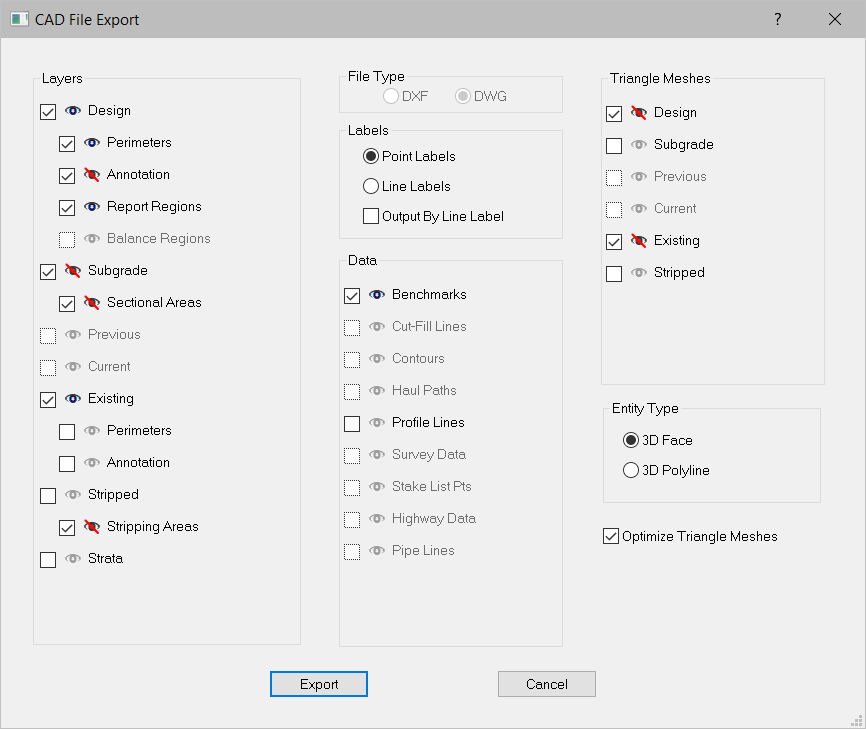 The export choices are broken down by Surface, Data, and Triangular Meshes. The type of file saved is chosen by checking either DXF or DWG.