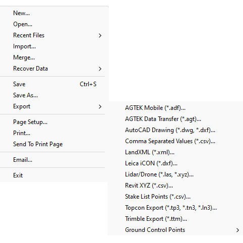 The Export command is used to export all data types other than Gradework ESW and ESZ format.. Below is a description of all the different file types that may be exported.