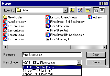 This command is used to join ESW, TTM and TN3 files together. Select the Merge command from the file menu to display the Merge window.