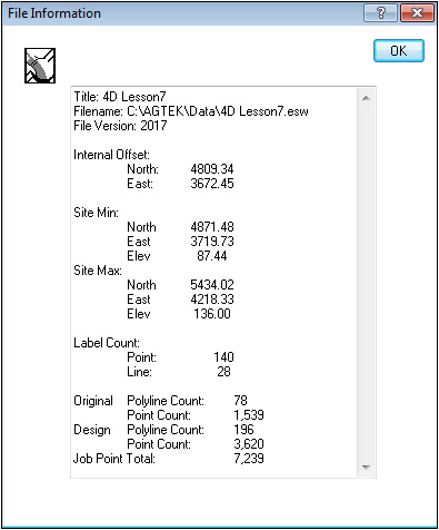 Displays the Title, File Name, Internal Offset, the Site Min/Max Northing/Easting, Elevation and Point/Line counts.