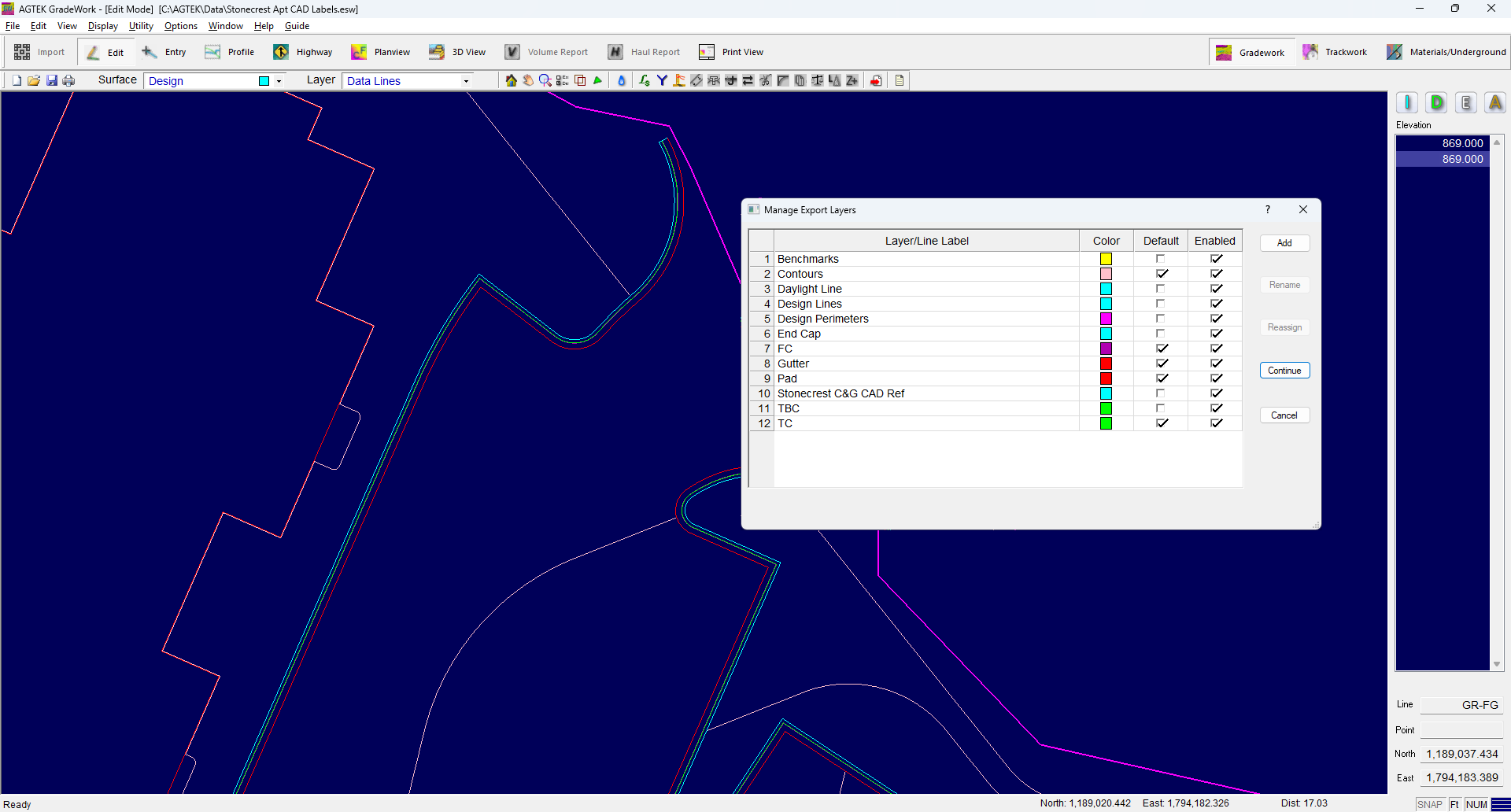 The Manage Export Layers window displays when exporting to DWG, DXF or LN3. Double-click on the color to change the color. Check Default if you want to use this color for the assigned layer name for future projects. Check Enabled for the layers you want to export to the file. You may also add new labels or reassign labels in this window.