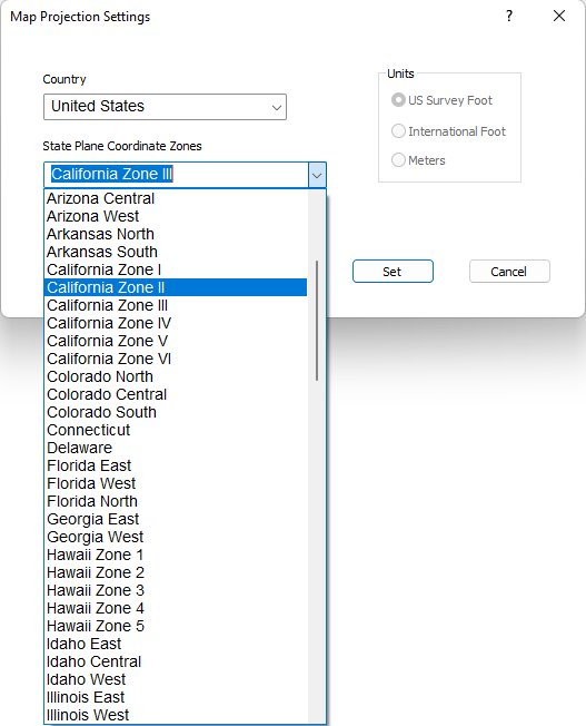 Used to add Benchmarks with Latitude/Longitude information based on State Plane Coordinate Zone projec tion. Select the Utility menu and select Transform Job > Map Projection Settings.
