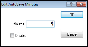 Auto Save allows you to set the interval between saves from 1 and 60 minutes. By default, the programs automatically set the save interval to 5 minutes. It is recommended that this feature not be disabled, however, if you wish to turn off the Auto Save function, check the box next to Disable in the window above and press OK.