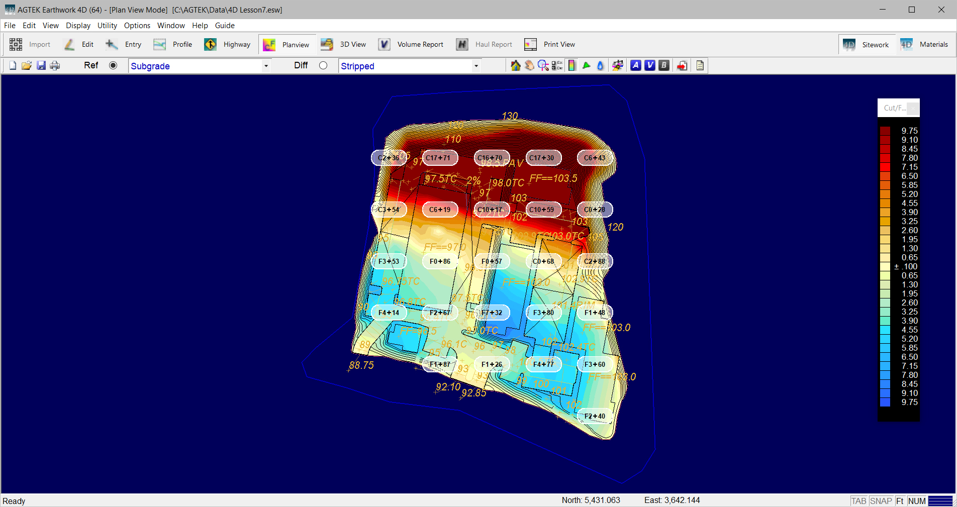 The Planview is the two-dimensional cut-fill shaded plan view of the data. The planview labels and Cut/Fill shade table can be displayed by selecting options located under the Display menu. The Shade Table can be displayed by selecting it under the Display Menu. Typing O on the keyboard toggles the display of the overlay. Typing T toggles the display of the cut/fill shading.