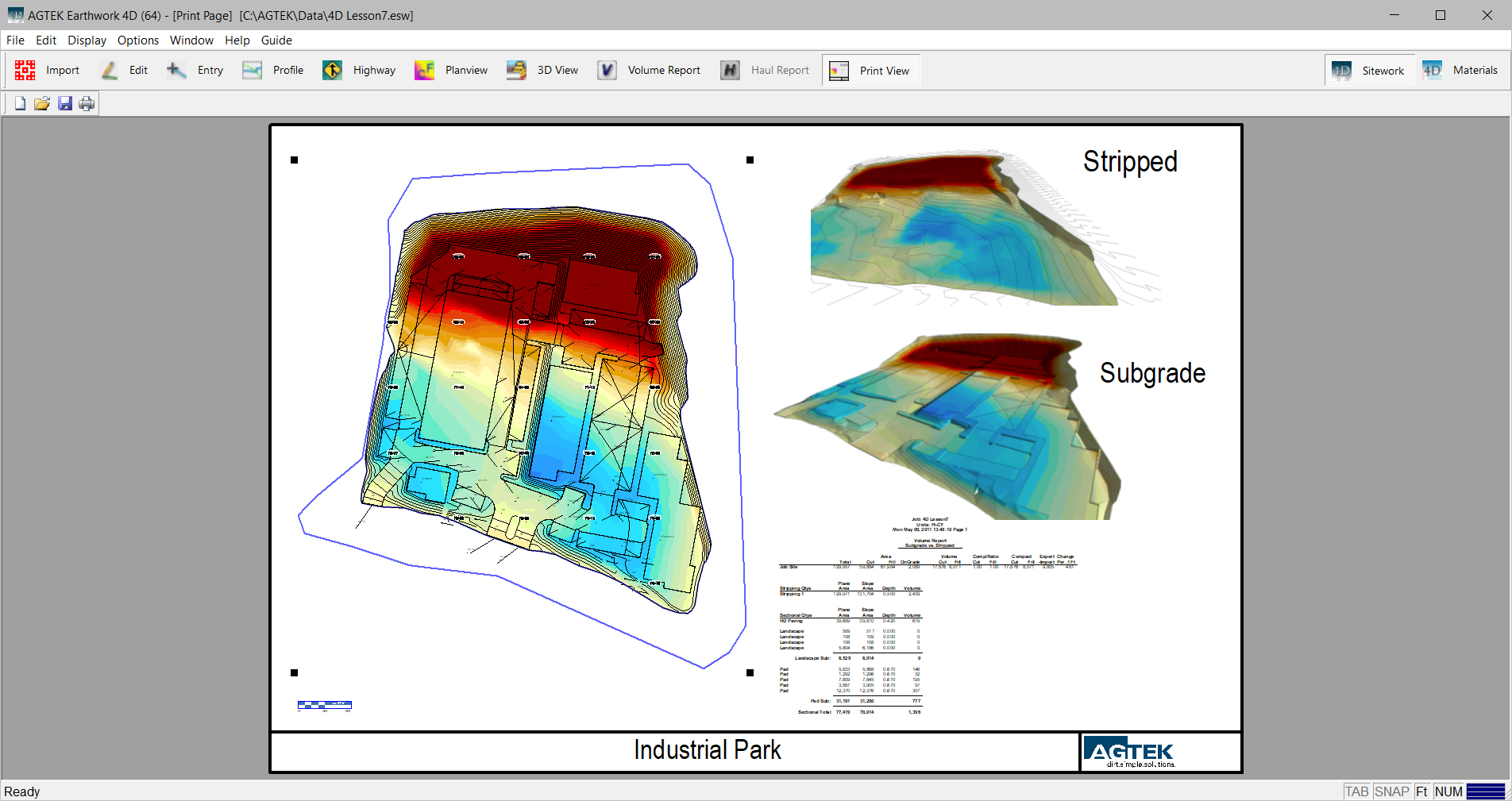 The Edit, 3D View, and Volumes window include a Send to Print Page command on the File menu. Selecting this command sends the current screen view to the Print Preview Window. The Print Preview window displays a representation of the page that will print with objects and text on the page. The white area is the printable area on the page. The grey area represents the printers margins.
