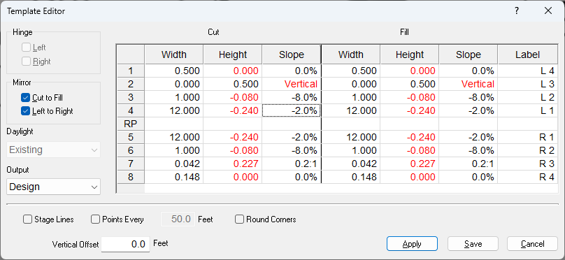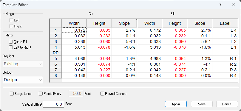 The window is split into two sides, Cut and Fill. This allows you to assign different parameters depending on the segment being in a cut or fill condition. The window is also split between left side and right side, based on the location of the reference point (RP). You may move the reference point by dragging the RP row to the desired position. A yellow diamond will mark the reference point on the template graphic. The currently selected segment will be highlighted in white.