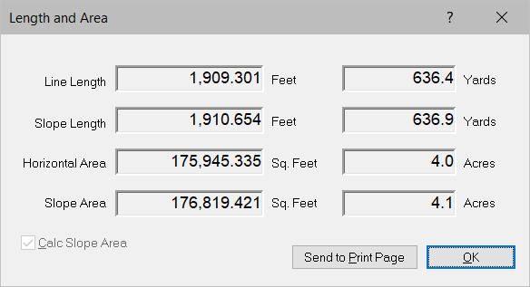The length and area information about entered data can be accessed by using the Length/Area Info command from the Utility Menu. by pressing the Length/Area button on the Utility Toolbar or by using the keyboard shortcut, I, in Edit Mode. It displays the length, slope length, horizontal and slope area. When a line is highlighted and the command is selected, the Length and Area window displays.