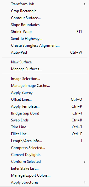Transform_Job Crop_Rectangle Contour_Surface Slope Boundaries Send_to_Highway Create_Stringless_Alignment Auto_Pad New_Surface Manage_Surfaces Image Selection Manage_Image_Cache Apply_Survey Offset_Line Apply_Template Bridge_Gap Swap_Ends Trim_Line Fillet_Line Length/Area_Info Compress_Selected Convert_Daylights Conform_Selected Enter Stake_List Manage_Export_Colors Apply_Structures