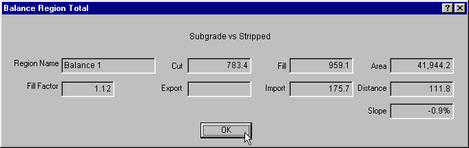 Press the Right Mouse button to close the region. The Balance Region Total window displays showing which surfaces were compared, the Region Name, Fill Factor, any Cut/Fill, Import/Export, as well as the Area of the region, distance of the haul and slope.