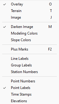 Overlay Terrain Bitmap Darken Image Modeling Colors Slope Colors Plus_Marks Line_Labels Group_Labels Station_Numbers Point_Numbers Point_Labels Time_Stamps Elevations