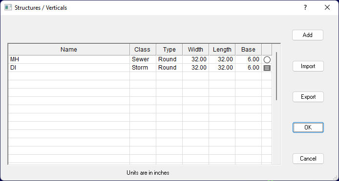 The Edit Verticals window is used to define the dimensions and type of Vertical structures. These dimensions are used solely for the 3D graphic representation of the Vertical structures. They have no effect on quantities.