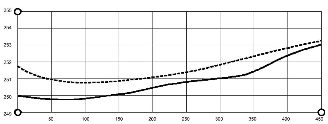 The entered profile now displays at the bottom of the screen and should match the one on the plan sheet. Since the profile is already scaled, switch the Ref surface to Existing and enter the profile for the Existing ground. Other profiles are entered using the steps previous listed. |