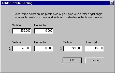 Using the elevation as the vertical, and the station distance as the horizontal, select three points with known vertical and horizontal coordinates, which form a right angle over the profile area on the plan sheet. On the profile example below, the three selected points are circled. |
