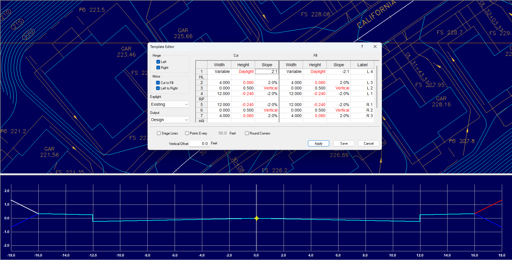 The Template Editor may be used to create a template using typical cross section information. The template may then be applied to a chosen reference line or multiple lines, which can be used to build jobs such as roads, canals and trenches.