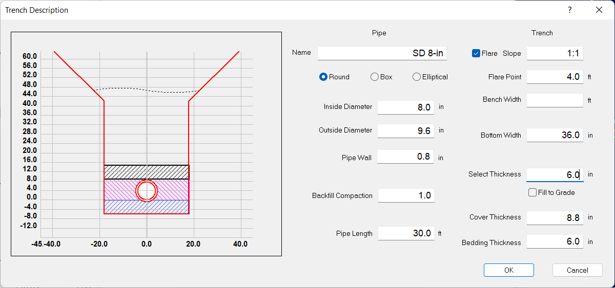 The Trench Description window is used to define the trench parameters to calculate the imported materials into the underground trench.