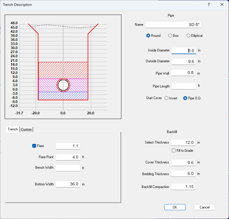 The trench volumes are based on the Trench Description defined for each Pipe or Lateral.