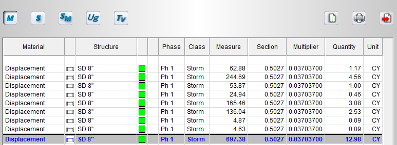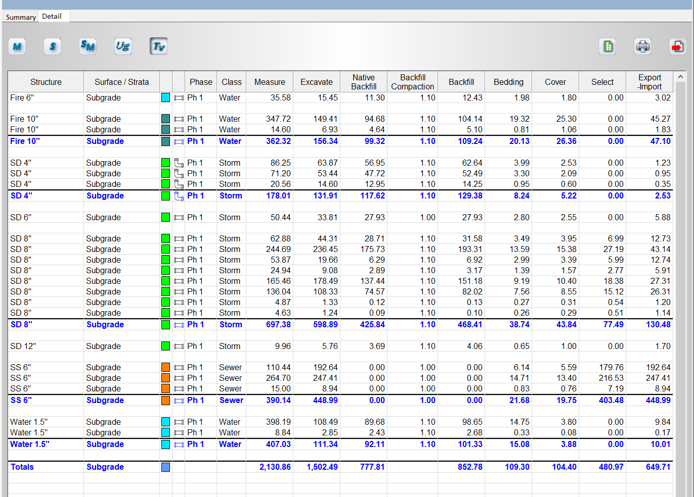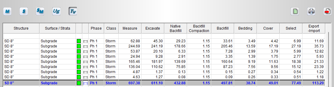 The Trench Volume Report display the volumes required to excavate the pipe and lateral structures. The report includes the total excavation, native backfill, bedding, cover and select materials.