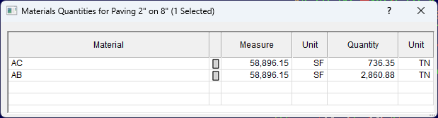 The Structure Name will be displayed in the dialog header. The Material, Measure, Quantity and Unit will display for each material in the structure. This only applies to a single structure. Multiple entries of the same structure may be selected. If multiple structures are selected, the information window will be empty.