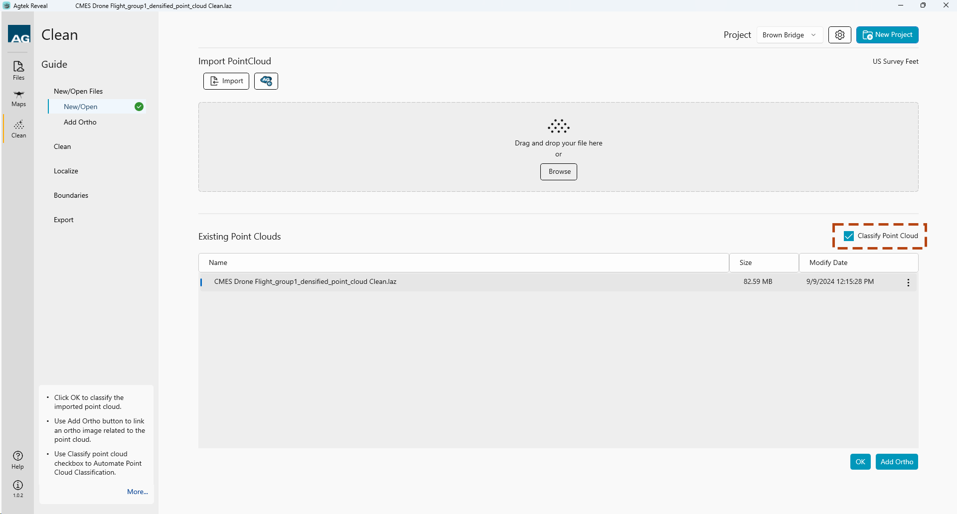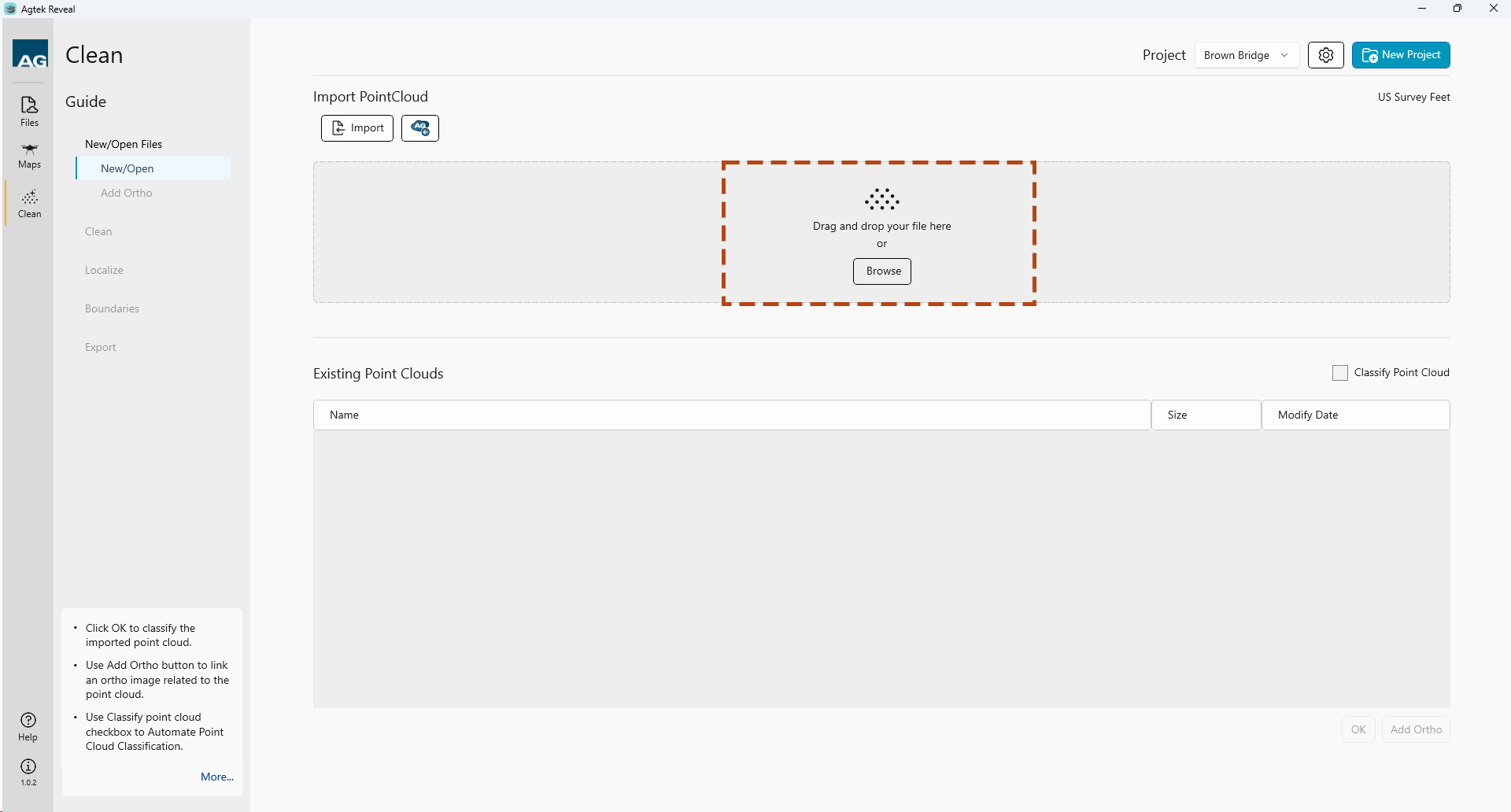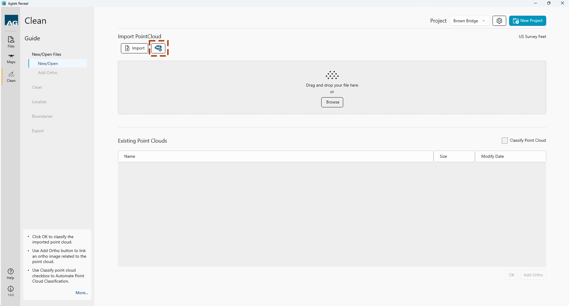 Upon selecting your Project data, Reveal will import your file and display the file in the Existing Point Clouds menu.