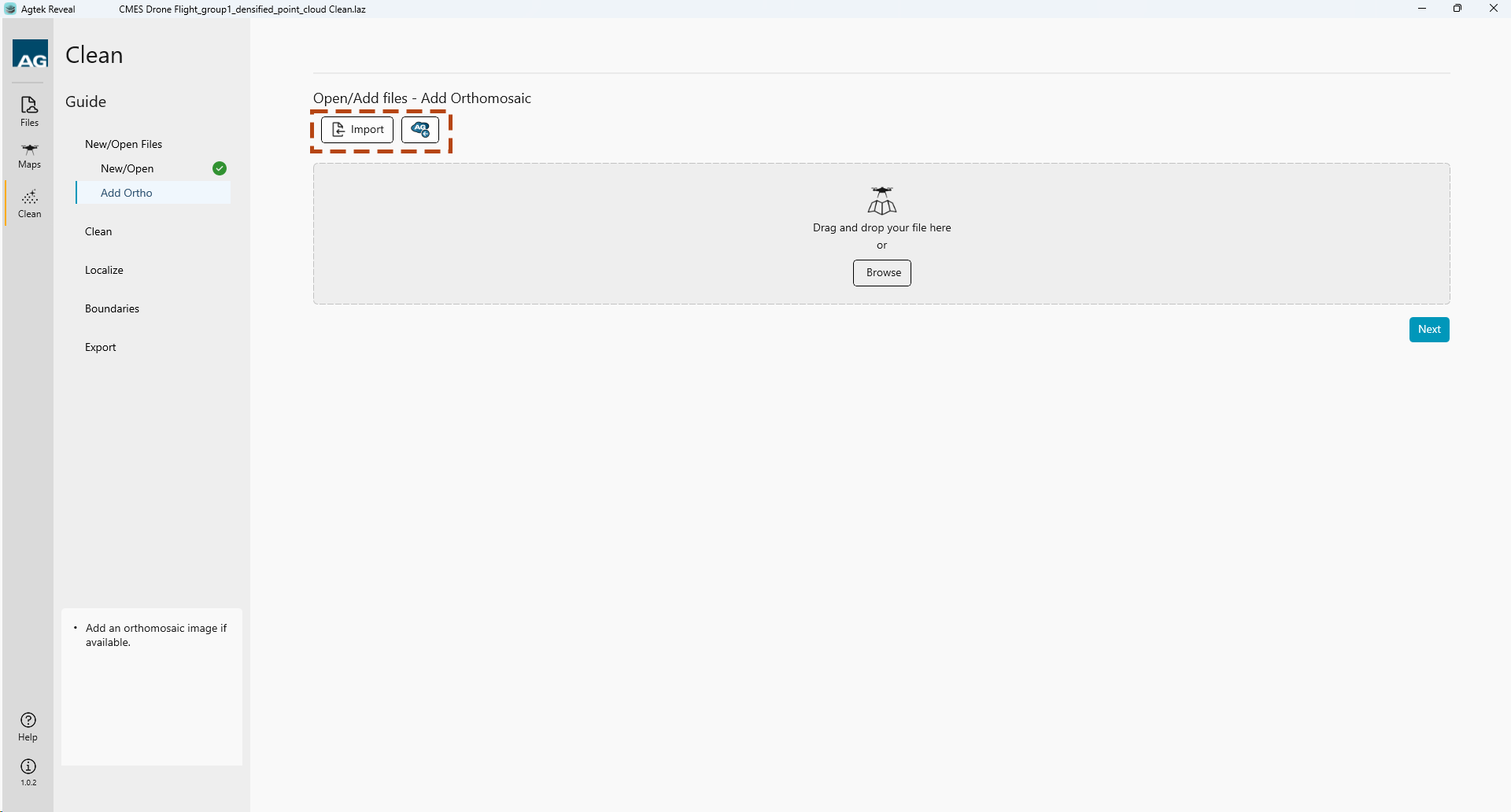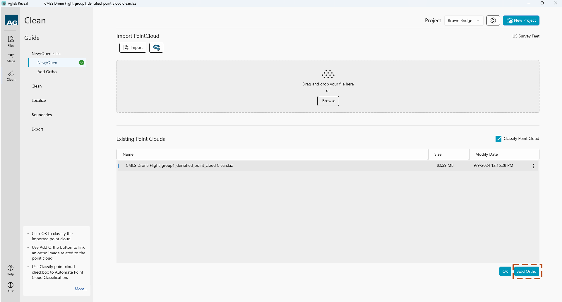 Select an Existing Point Cloud file, then click the Add Ortho button