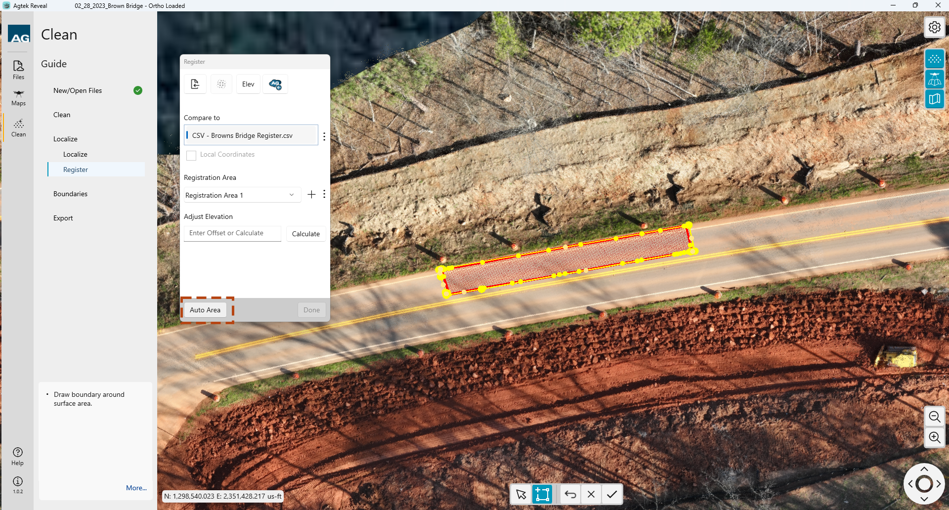 Once you have loaded your registration file or point cloud the points will be highlighted. You will need to create a boundary around your registration area. That can be accomplished by selecting the Auto Area button at the bottom of the dialog box or by drawing a boundary manually.