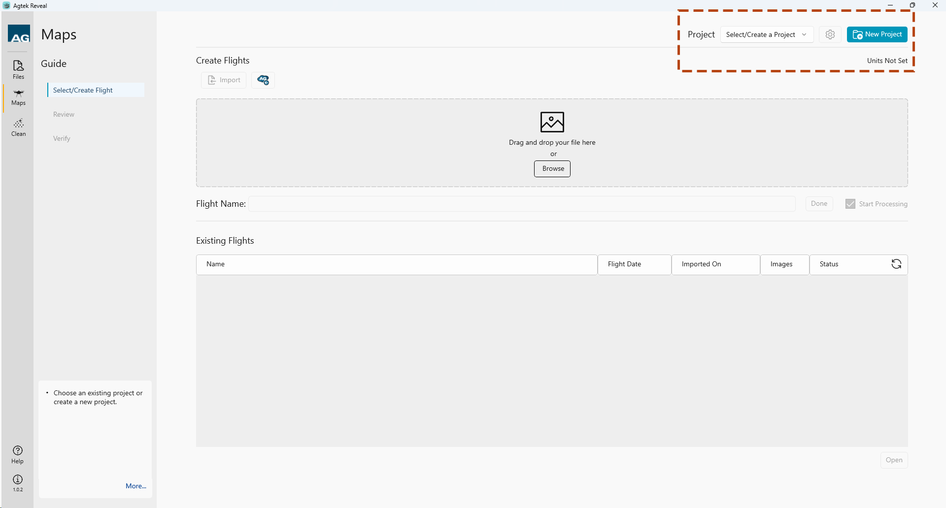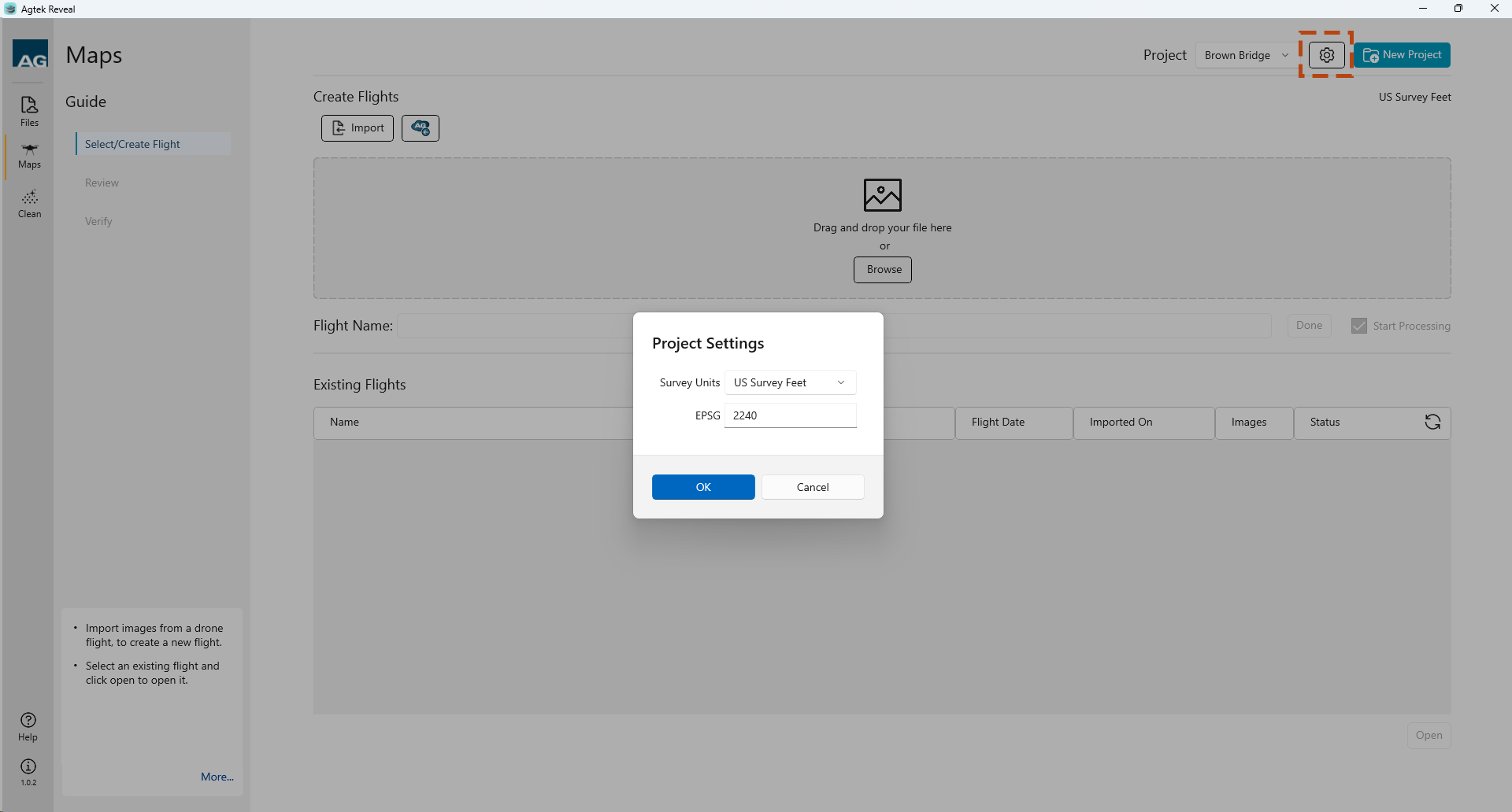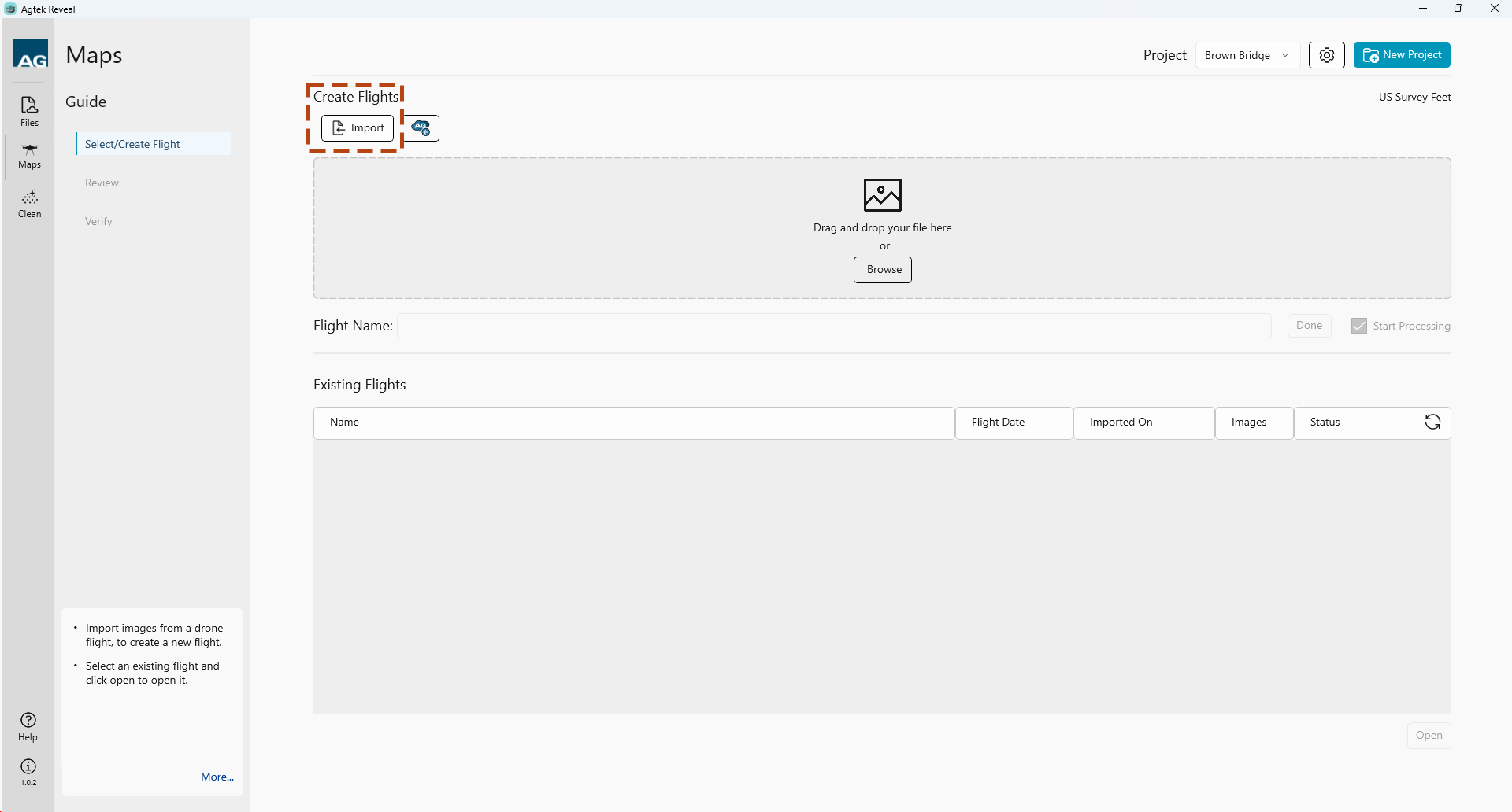 Upon selecting your Photos, Reveal Maps will import your files and display a name in the Flight Name menu.