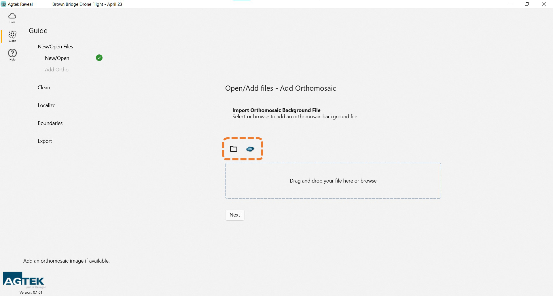 Upload your Orthomosaic image by dragging and dropping or selecting the Local or Agtek Access icons. Accepted file types is tiff.