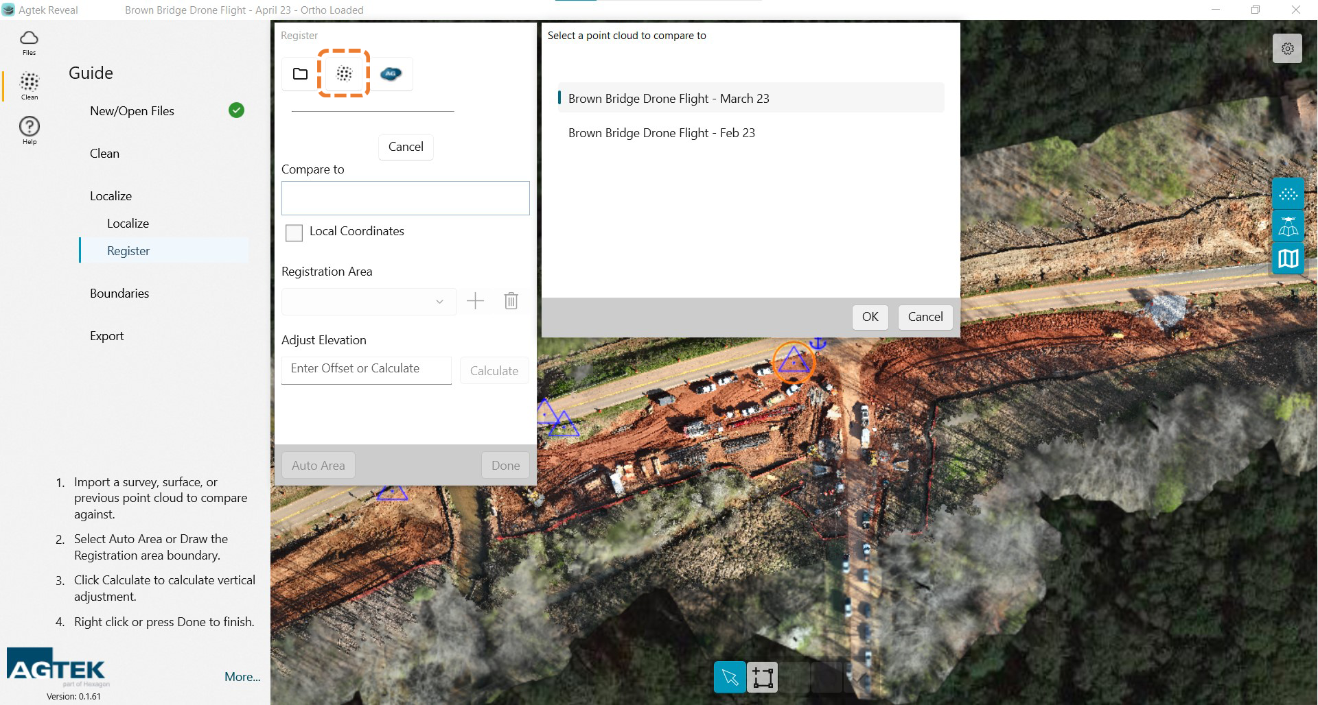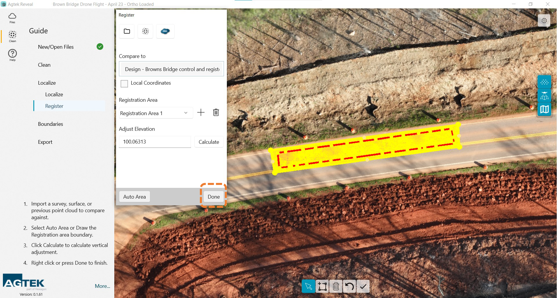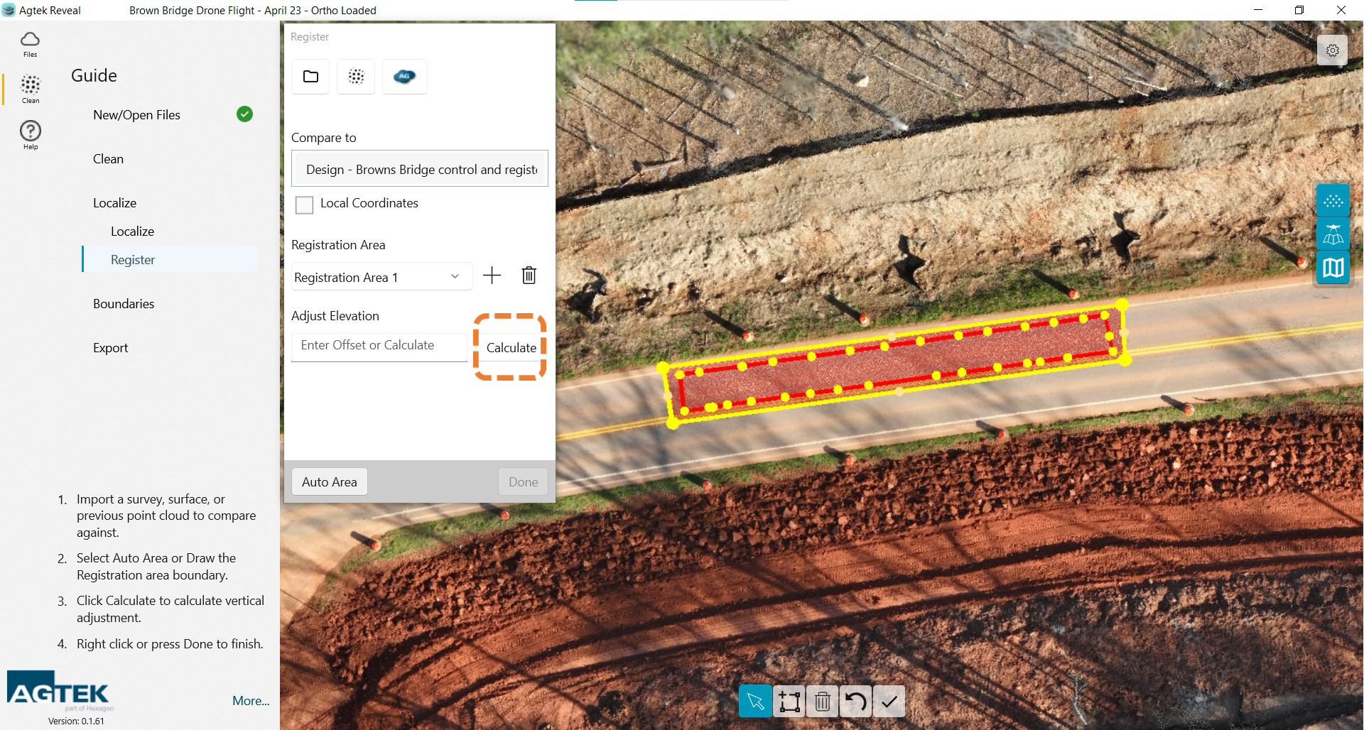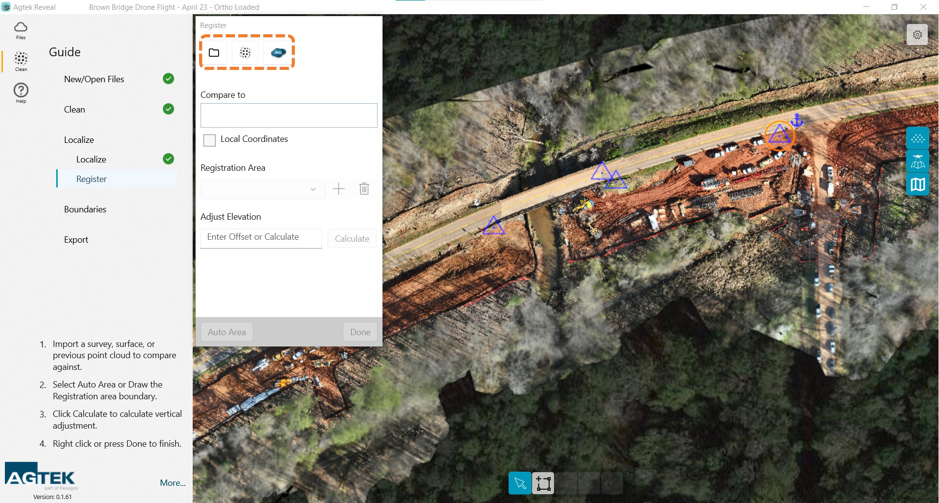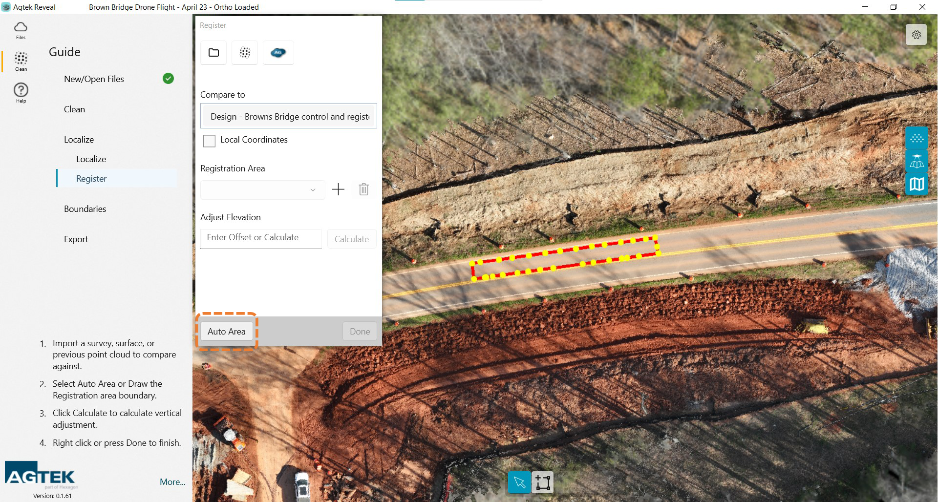 Once you have loaded your registration file or point cloud the points will be highlighted. You will need to create a boundary around your registration area. That can be accomplished by selecting the Auto Area button at the bottom of the dialog box OR by drawing a boundary manually.