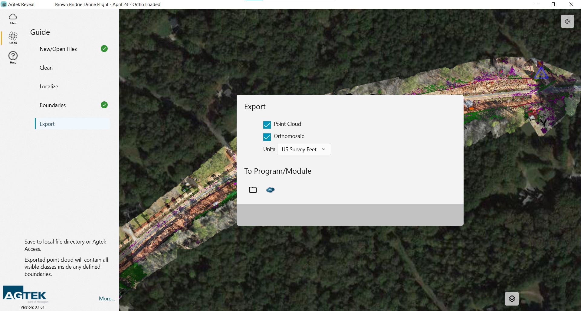 Reveal allows you to export your optimized data sets to your local machine or directly to Agtek Access. Select the data you would like to include then the location icon you wish to save into.