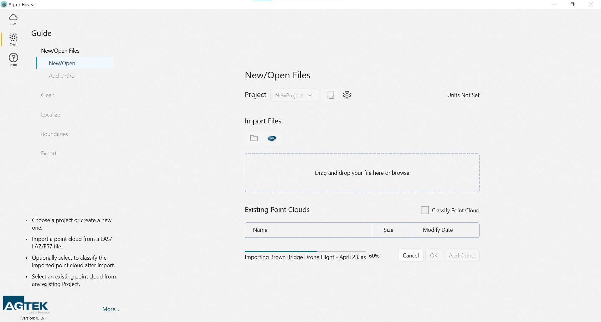 Upon selecting your Project data, Reveal will import your file and display the file in the Existing Point Clouds menu.