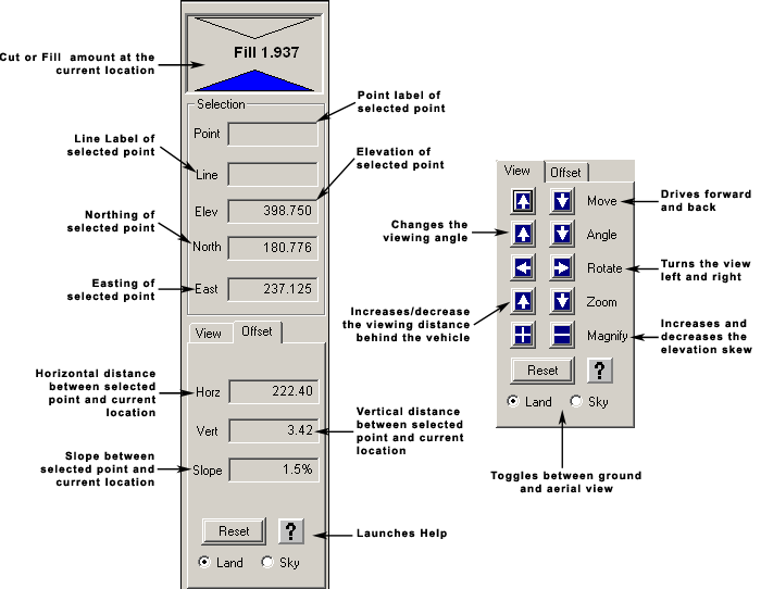 The 3D Controls window is located on the 3D View mode screen. It is used to adjust the display of the 3D Terrain view. Below is an example of the 3D Control window with explanations of the different functions.
