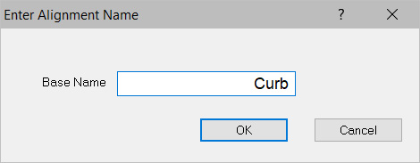 This window allows you to name stringless alignment. The window will display when creating stringless alignments for curb and gutter machines. Enter a Base Name. If multiple lines are selected, the base name will be followed by a number..