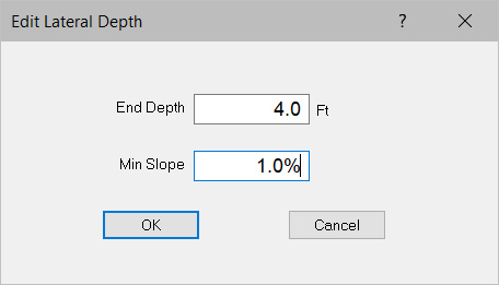 The Edit Lateral Depths window is used to define the parameters for calculating the elevation of the end of a lateral entry. You may set an end depth or a minimum slope. If the end depth results in a slope less than the minimum slope, it will use the slope.