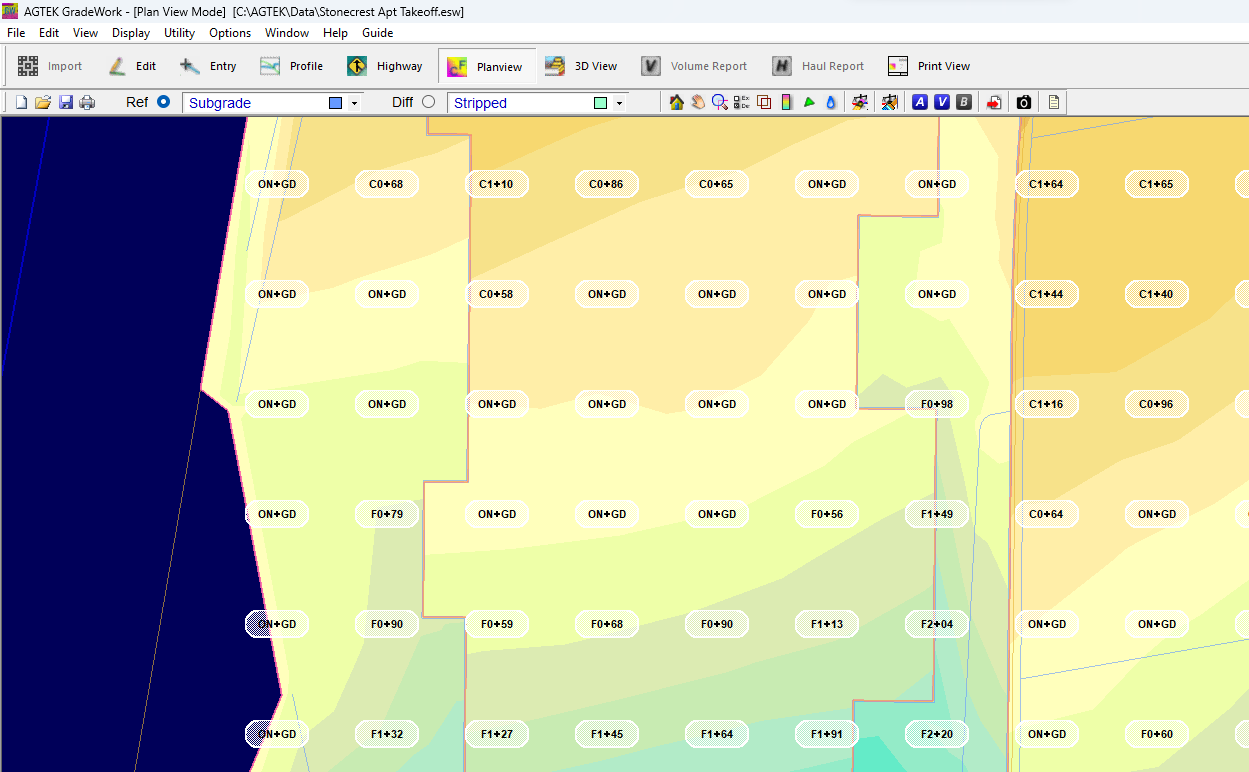 The On-Grade Limit also establishes the depth of cut/fill displayed on the Planview Cut/Fill Grid and 3D View as you drive across the site. If the depth of cut or fill is less than the OnGrade Limit, the depth will display as ON+GD.
