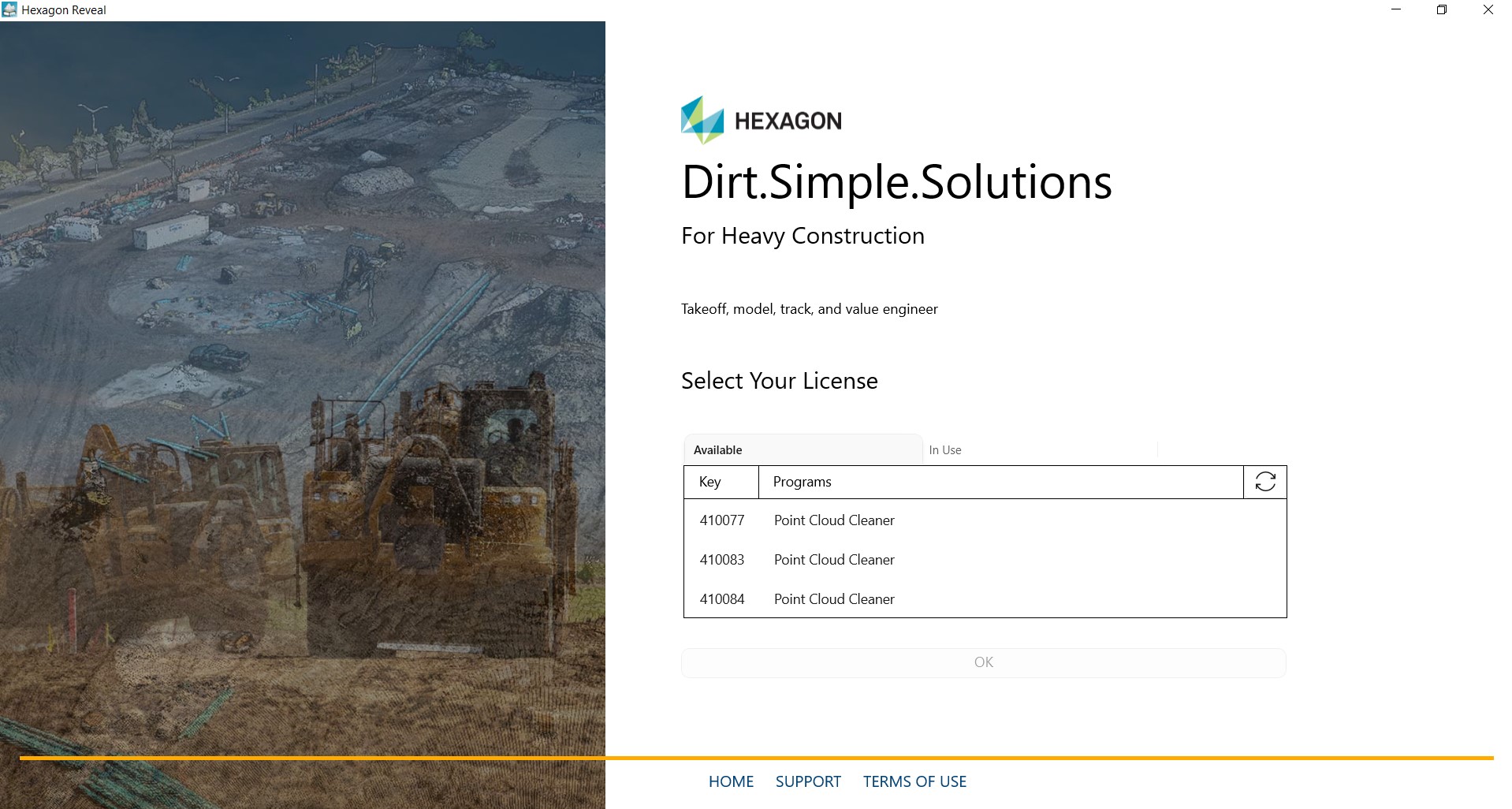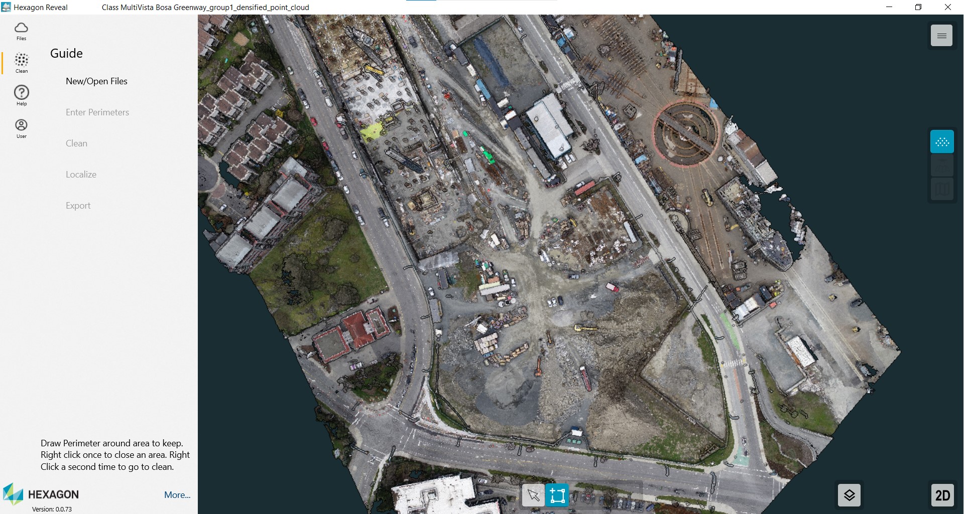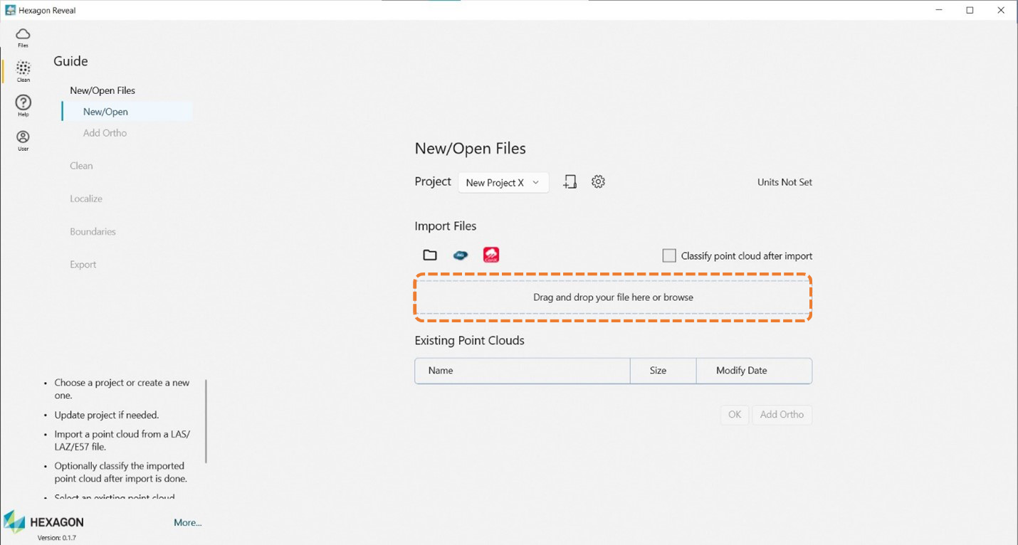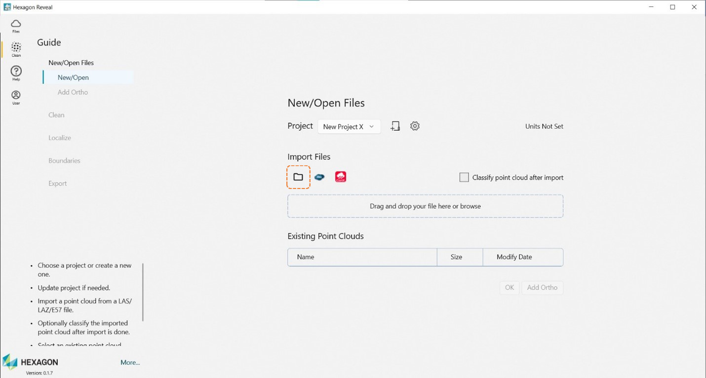 Upon selecting your Project data, Reveal will import your file and display the file in the Existing Point Clouds menu.