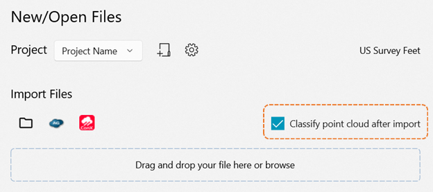 Note: Selecting Classify after import will make the file unavailable until classification is complete. The time to complete varies with the project data and hardware speed. Once complete the file will be available to use and listed in the Existing Point Clouds menu.