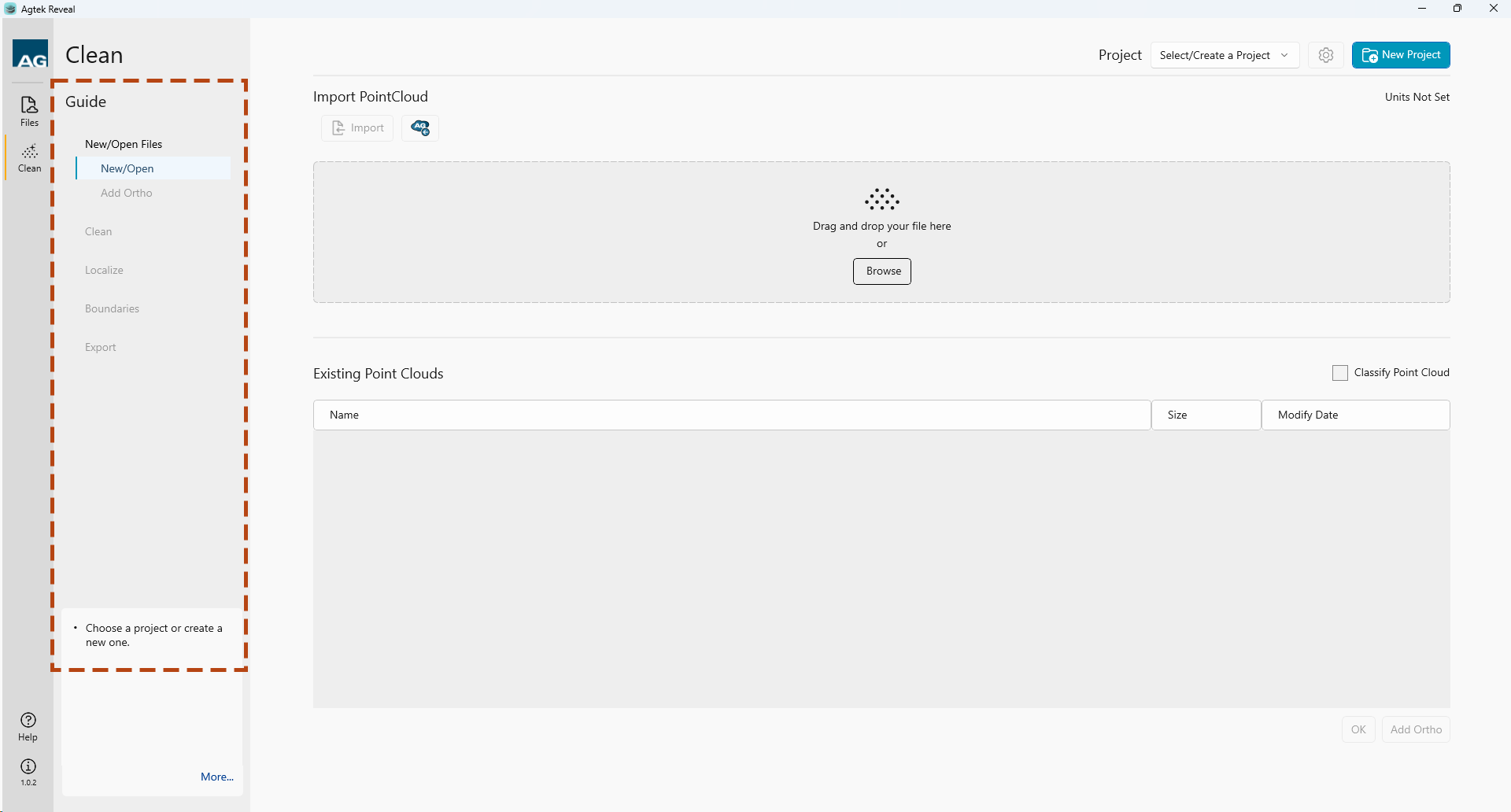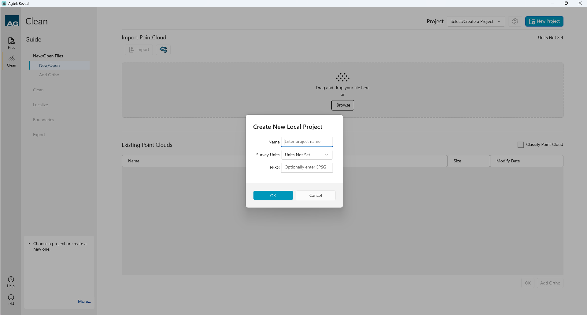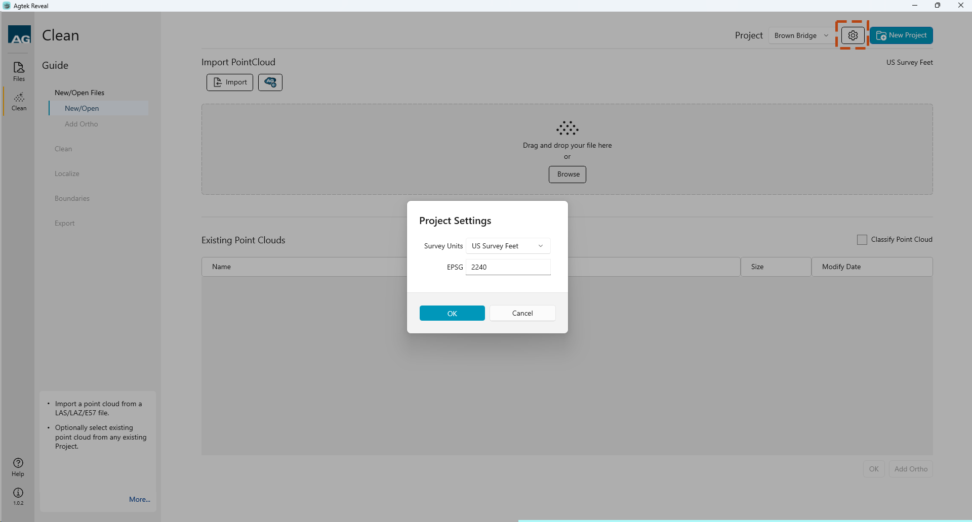 Upon selecting your Project data, Reveal will import your file and display the file in the Existing Point Clouds menu.