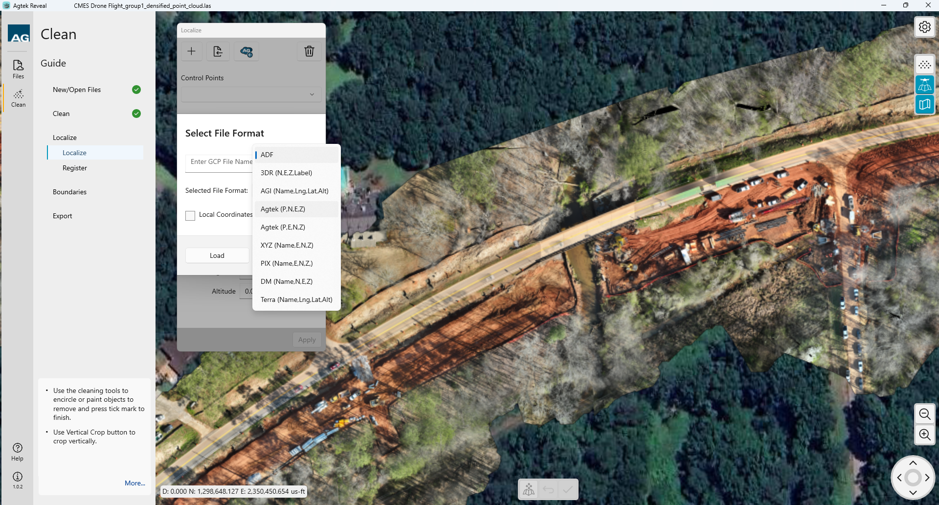 Reveal accepts control point files from many photogrammetry engines as well as Agtek adf files. Select the format you would like to use from the drop down menu.