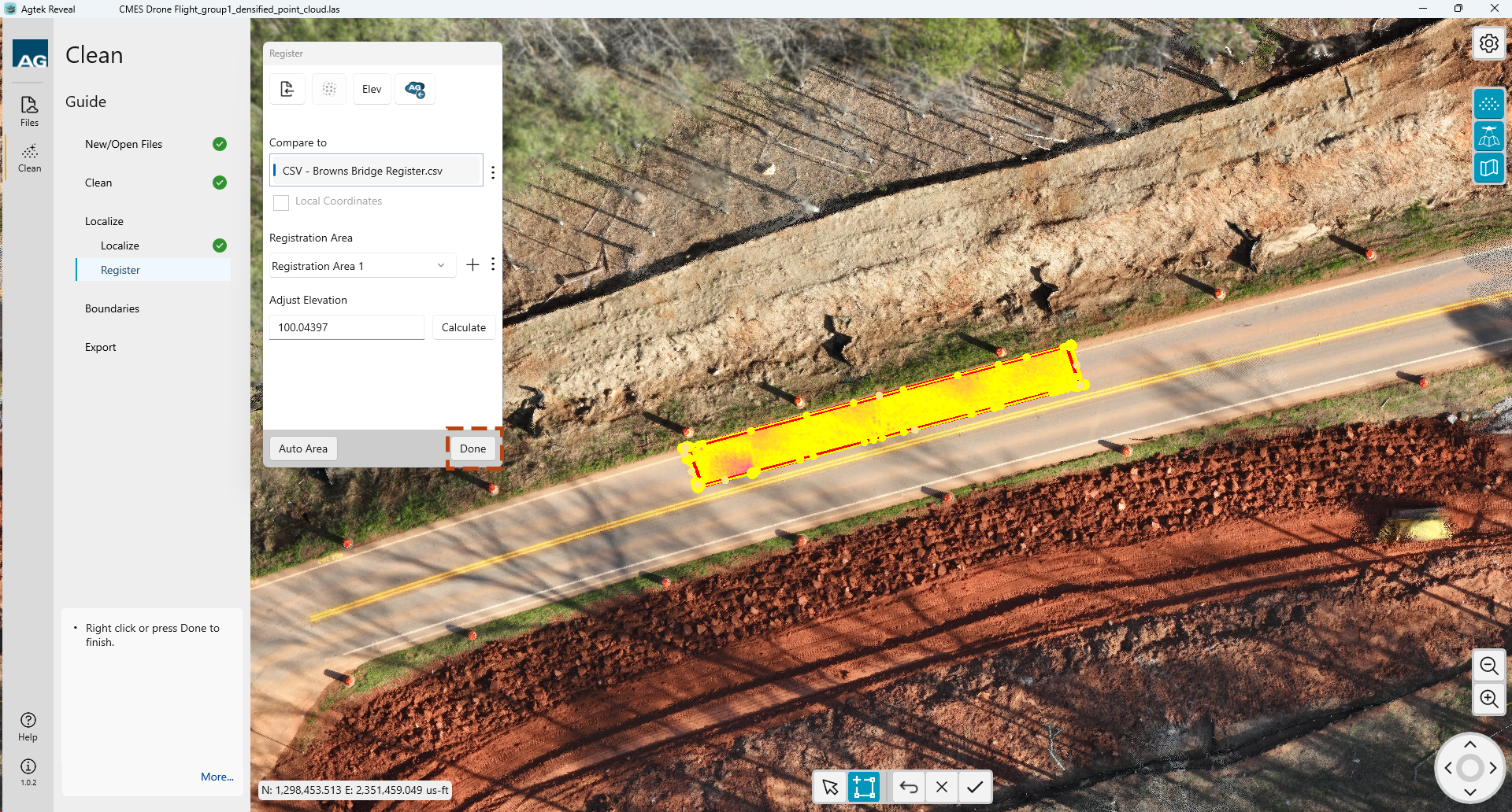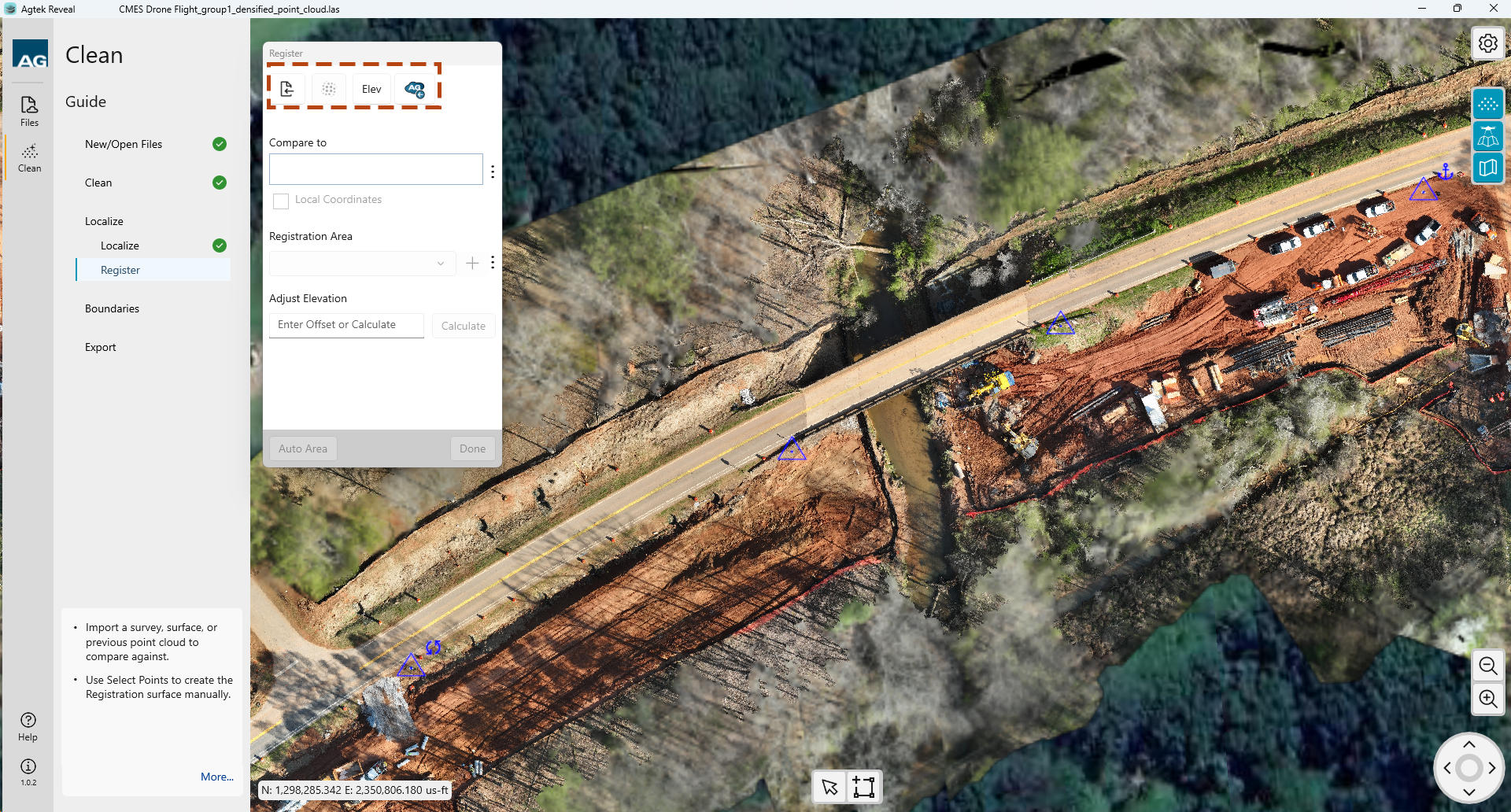 Once you have loaded your registration file or point cloud the points will be highlighted. You will need to create a boundary around your registration area. That can be accomplished by selecting the Auto Area button at the bottom of the dialog box OR by drawing a boundary manually.