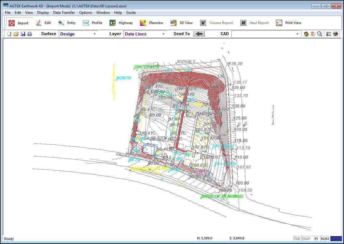Import Mode is used to transfer the layers of a CAD file into Earthwork 4D. Different layers can be chosen and sent either the Design or Existing Surface. The data can be further defined by transferring the lines to a specific layer within each surface.