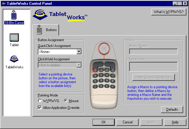Double-click on the TabletWorks icon to display the TabletWorks Control Panel. Choose the “16-Btn Cursor” icon on the left to display the following window.